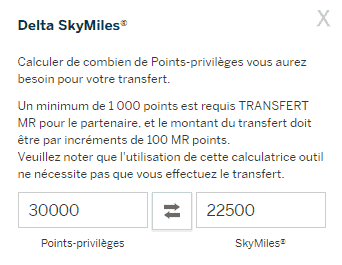 Ainsi, pour 30 000 points-privilèges, vous obtiendrez 22 500 miles Delta Skymiles: