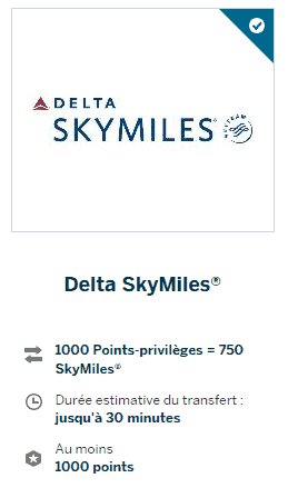 Le transfert de points-privilèges vers des miles Delta Skymiles est instantané. C’est un très bel avantage: cela vous permet de conserver vos points-privilèges jusqu’à la dernière minute, c’est à dire le moment ou vous avez trouvé vos billets primes!