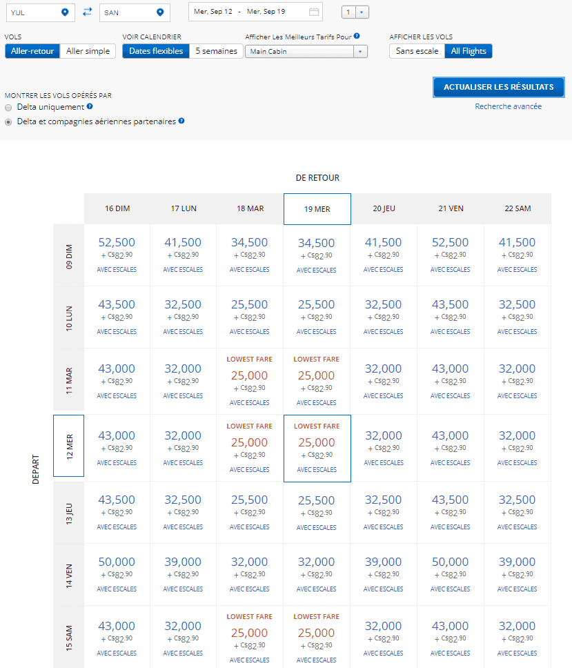 Pour cet itinéraire entre Montréal et San Diego, le minimum est de 25 000 miles + 83$.