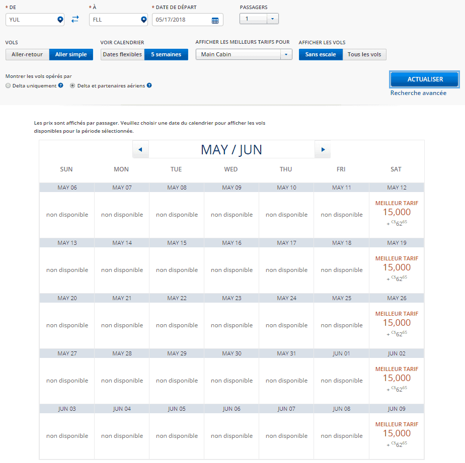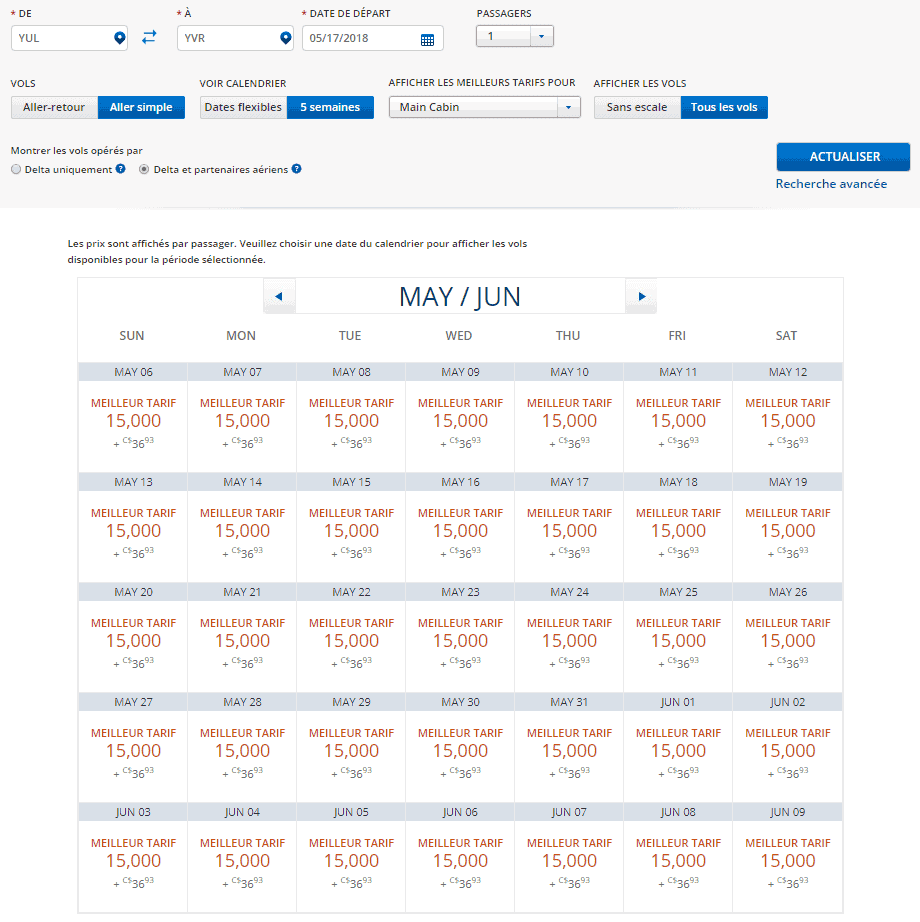 Beaucoup de dates disponibles sur ces vols directs entre Montréal et Vancouver. Le tarif est ici de 15 000 Skymiles + 37$ aller simple.