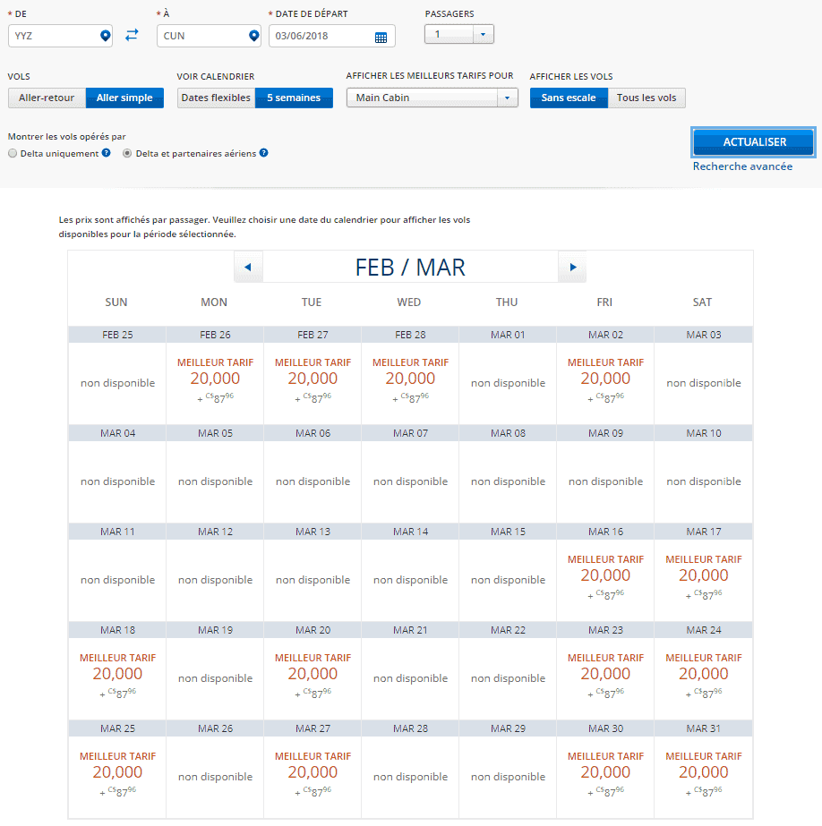 Pour rejoindre Cancun (Mexique) depuis Toronto sur un vol direct de WestJet, il vous en coûtera 20 000 Delta Skymiles et 88$.