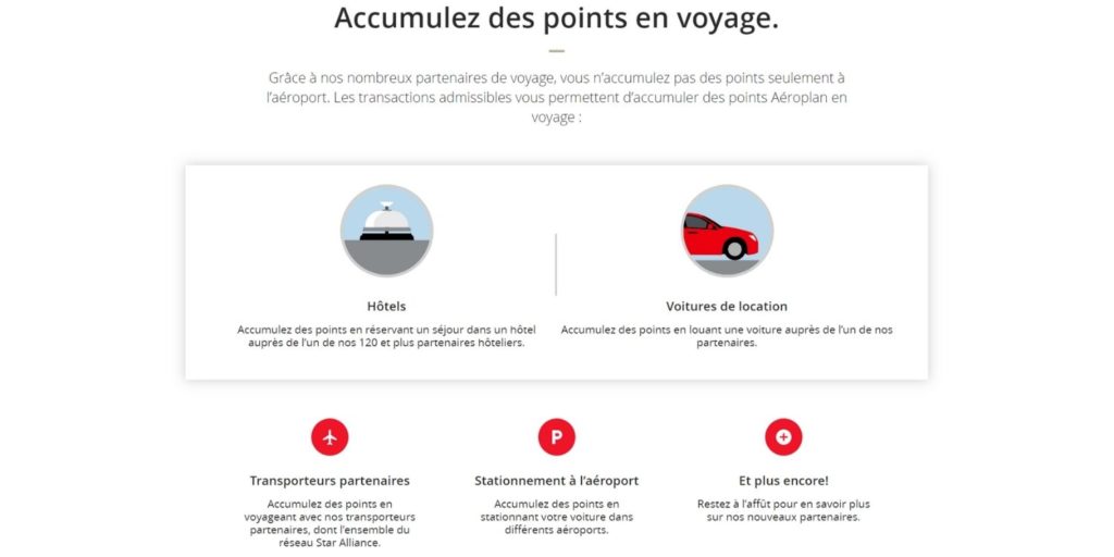 Aéroplan permet aux membres de cumuler des points de différentes manières, notamment en voyageant avec Air Canada et d’autres partenaires aériens, en utilisant une carte de crédit affiliée au programme, en séjournant dans des hôtels partenaires, en louant des voitures auprès de sociétés affiliées, ou en effectuant des achats auprès de divers détaillants partenaires.