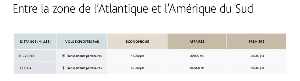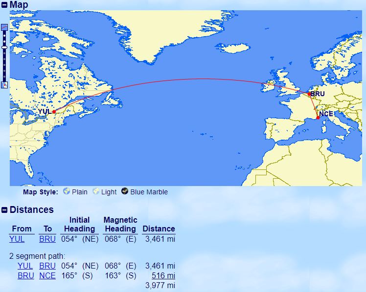Alors qu’en choisissant de passer par Bruxelles pour rejoindre Nice, nous restons dans la catégorie 0 – 4 000 miles pour les voyages entre les zones Amérique du Nord et Atlantique. Le coût en points est de 35 000 points en classe économique.
