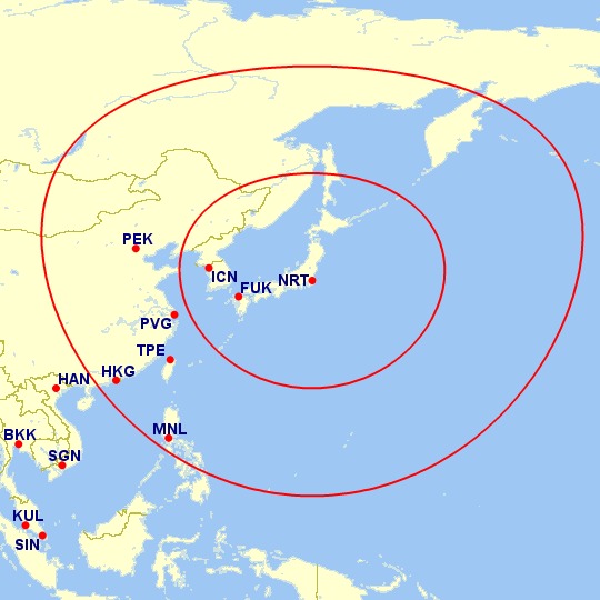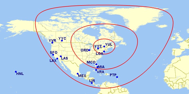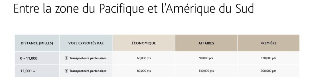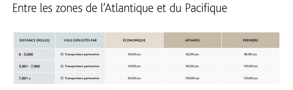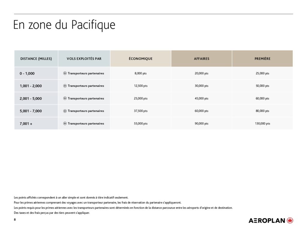 Ensuite, Aéroplan subdivise chaque zone de voyage avec un critère de distance en milles: plus la distance parcourue sera élevée, plus le coût en point sera important.