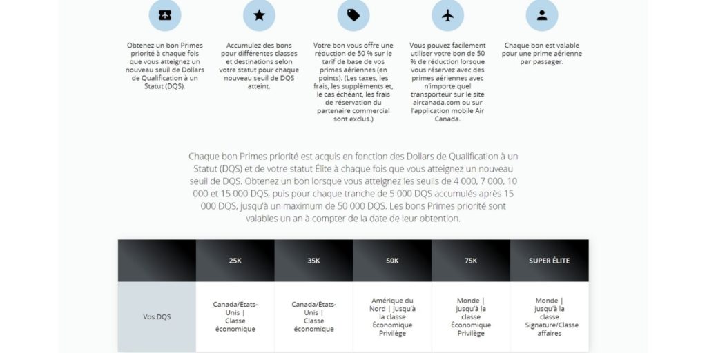 Ces Primes Priorité permettent d’obtenir un coupon-rabais de 50 % pour certaines zones géographiques ou cabines en fonction de votre niveau de statut. À chaque fois que vous franchissez un palier de Dollars de Qualification à un Statut (DQS), vous obtiendrez un coupon-rabais additionnel, jusqu’à 11 coupon-rabais par année.