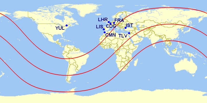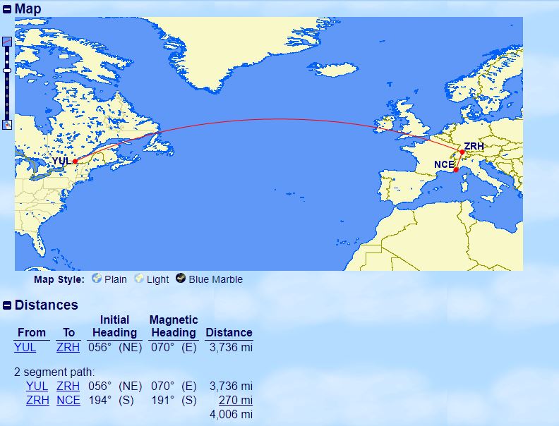 En ajoutant une correspondance vers Nice, un vol Montréal – Zurich – Nice a une distance de 4 006 miles. Ce voyage se classe donc dans la catégorie 4 001 – 6 000 pour les voyages entre les zones Amérique du Nord et Atlantique. Le coût en points est de 40 000 points en classe économique. Soit 5 000 points de plus.