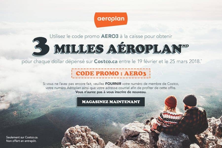 Une promotion très intéressante du côté d’Aéroplan! Jusqu’au 25 mars 2018, vous pourrez accumuler 3 miles aéroplan par dollar dépensé sur le site de Costco.ca en appliquant le code promotionnel AERO3,