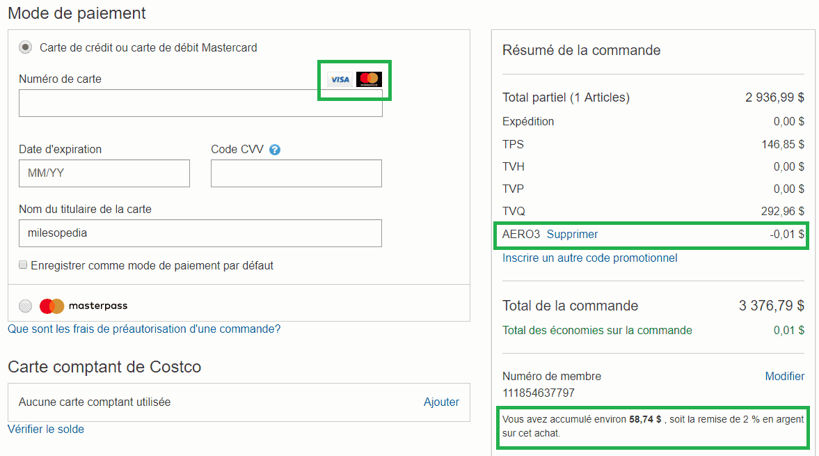 Hormis cette carte, toute carte Visa (on pense aux carte affiliées à Aéroplan) ou Mastercard peuvent vous permettre d’accumuler points, remises et miles sur Costco.ca!