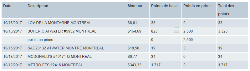 Comme vous pouvez le voir dans la capture ci-dessus, j’ai tenté l’achat direct en SAQ avec la carte. Seulement 1 point par dollar! Il est donc plus intéressant d’acheter une carte-cadeau SAQ dans votre épicerie ou dépanneur pour avoir 5 points par dollar!