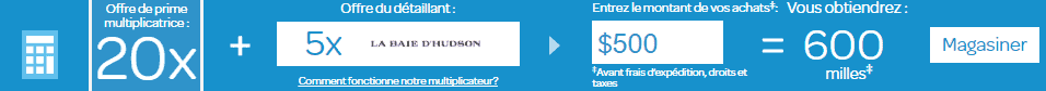 Pour vous aider à y voir plus clair sur le nombre final de milles AIR MILES obtenus, une calculatrice vous est proposée. Voici par exemple ce que donne un achat de 500$ auprès de La Baie qui offre 5X les milles AIR MILES.