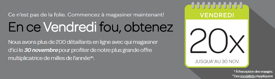Du 25 au 28 novembre, TD propose aux titulaires d’une carte de crédit affiliée à Aéroplan d’obtenir 2 milles / dollar dépensé dans les épiceries, stations-services et pharmacies.