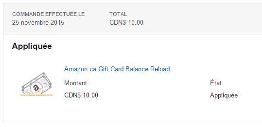 Comment j’en ai profité? N’ayant rien à acheter en ce moment sur Amazon, j’ai simplement « rechargé » à 3 reprises la balance de ma carte-cadeau Amazon de 10$!