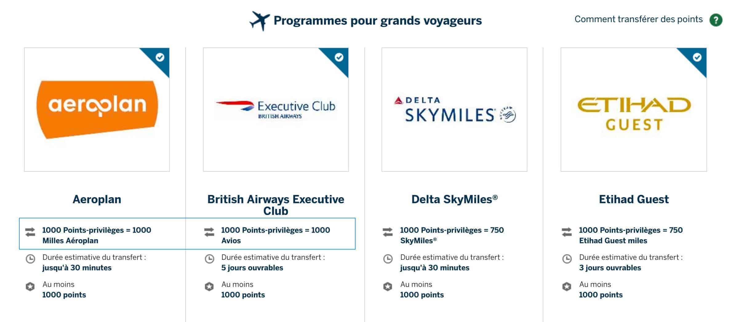 Cependant, les conversions les plus avantageuses restent vers Aéroplan et British Airways Executive Club (1 pour 1).