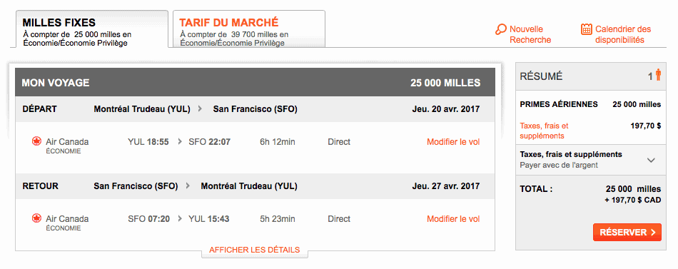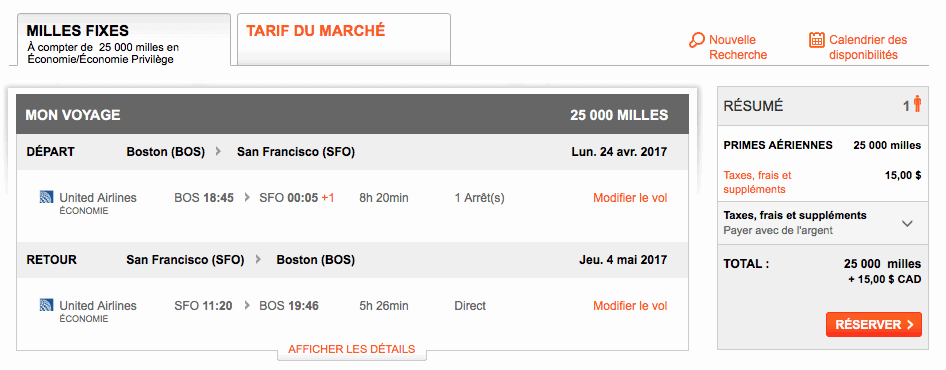 On en parle souvent mais il est vrai que les surcharges de carburant peuvent être très élevées avec Air Canada donc il peut faire sens de regarder dans les aéroports proches des Montréal où United opère étant une compagnie avec peu de frais. Voici une comparaison, le trajet coûte dans les deux cas 25 000 miles mais 197$ par personne pour Air Canada contre 15$ avec United!