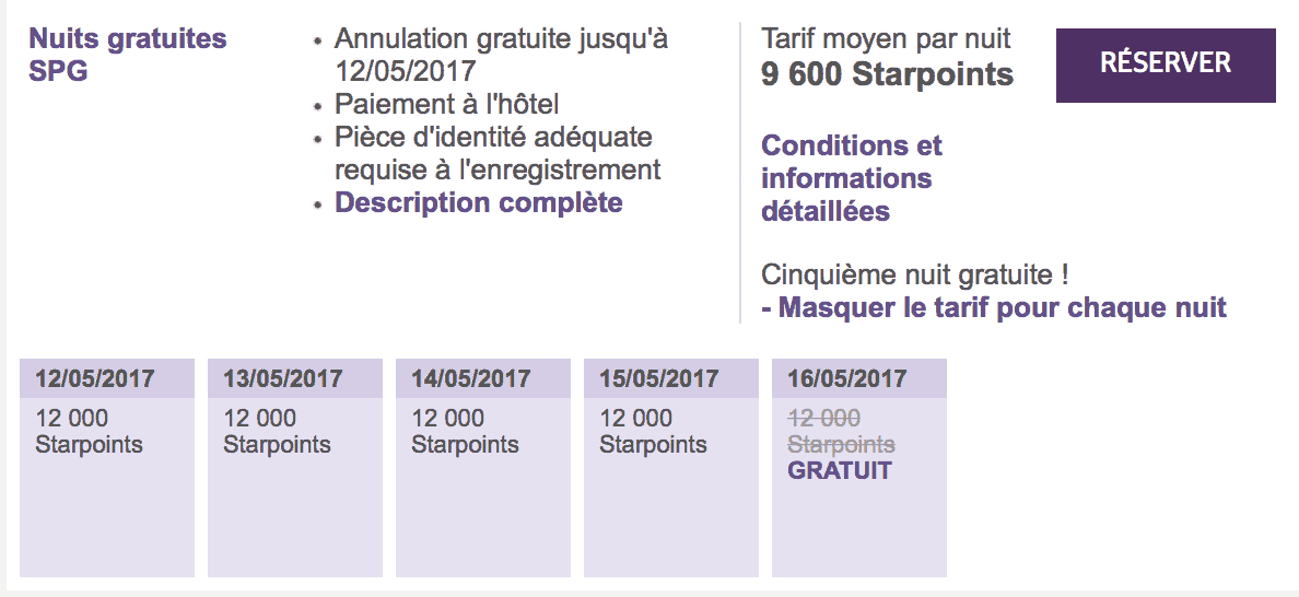 C’est ici que la valeur de vos points prend encore plus son sens. Avec le cours du dollars canadien en dollars US les nuits d’hôtel aux États-unis représentent une grosse part du budget. André a donc utilisé la fameuse politique de SPG : 4 nuits réservées , une de gratuite: